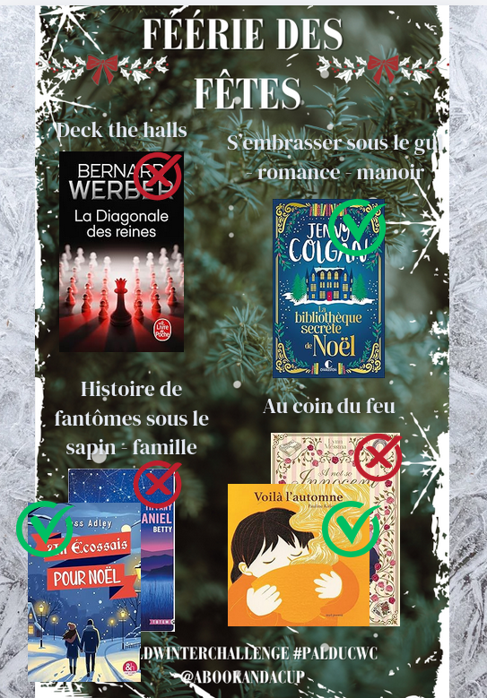 Lecture prévue : La bibliothèque secrète de Noël, Jenny Colgan : LUE – Je n’ai que peu accroché. Je n’aimais pas les personnages et la chasse au trésor m’a fatiguée. L’ambiance « manoir sous la neige » était sympa cependant.